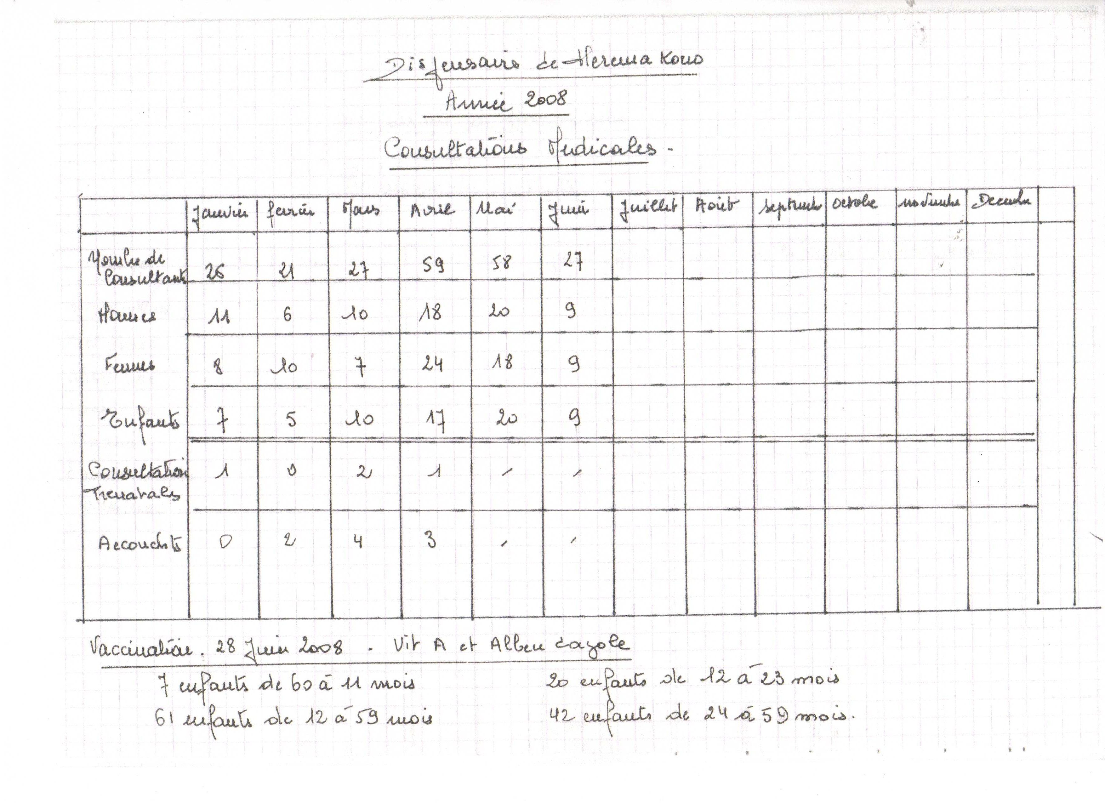 bilan de l'activité du dispensaire en juin 2008. La fréquentation est beaucoup plus restreinte qu'elle ne l'était l'année précédente à la même époque - cela vient principalement des changements de personnel soignant. Nous étudions la meilleure façon de relancer l'activité.