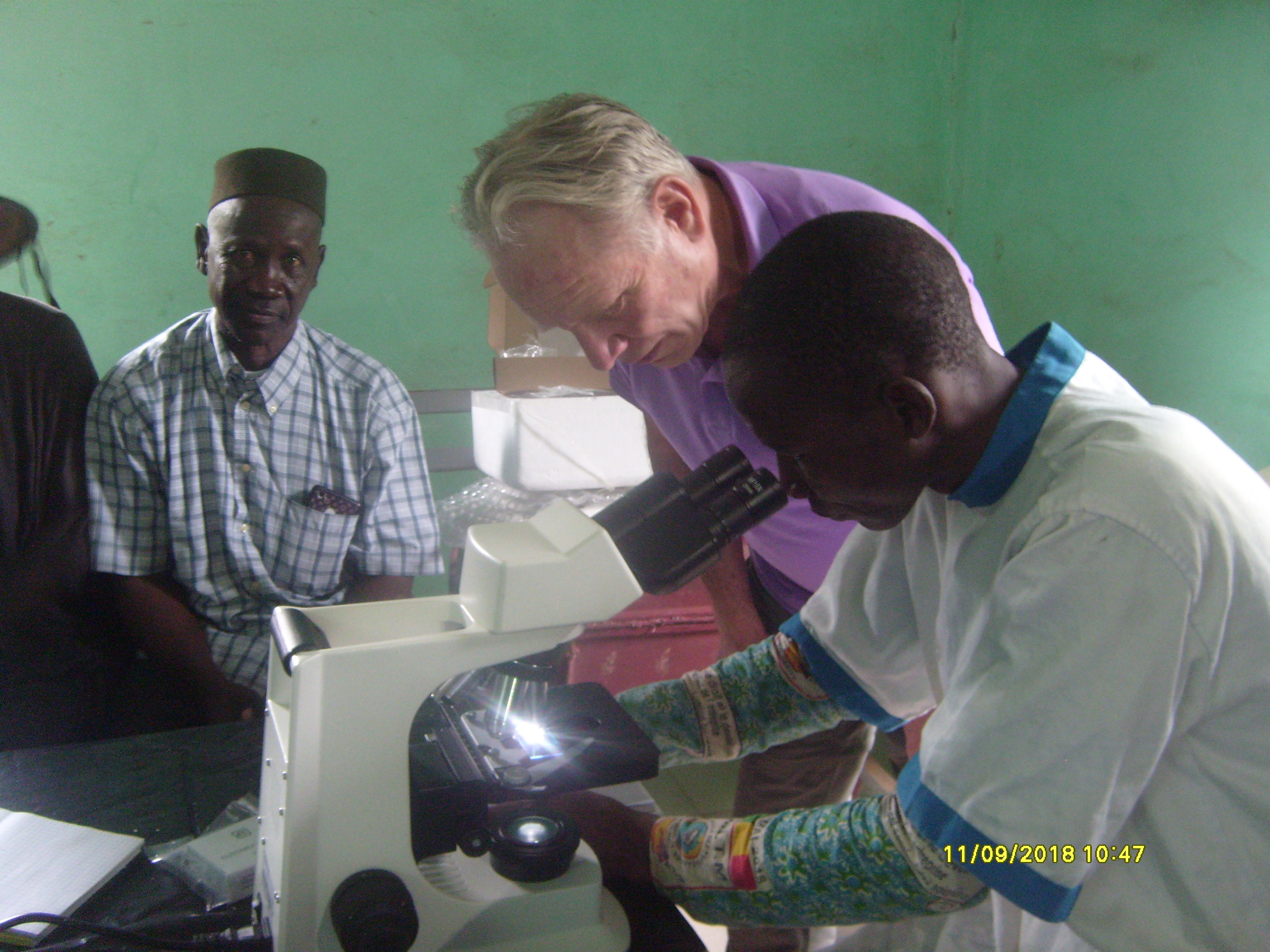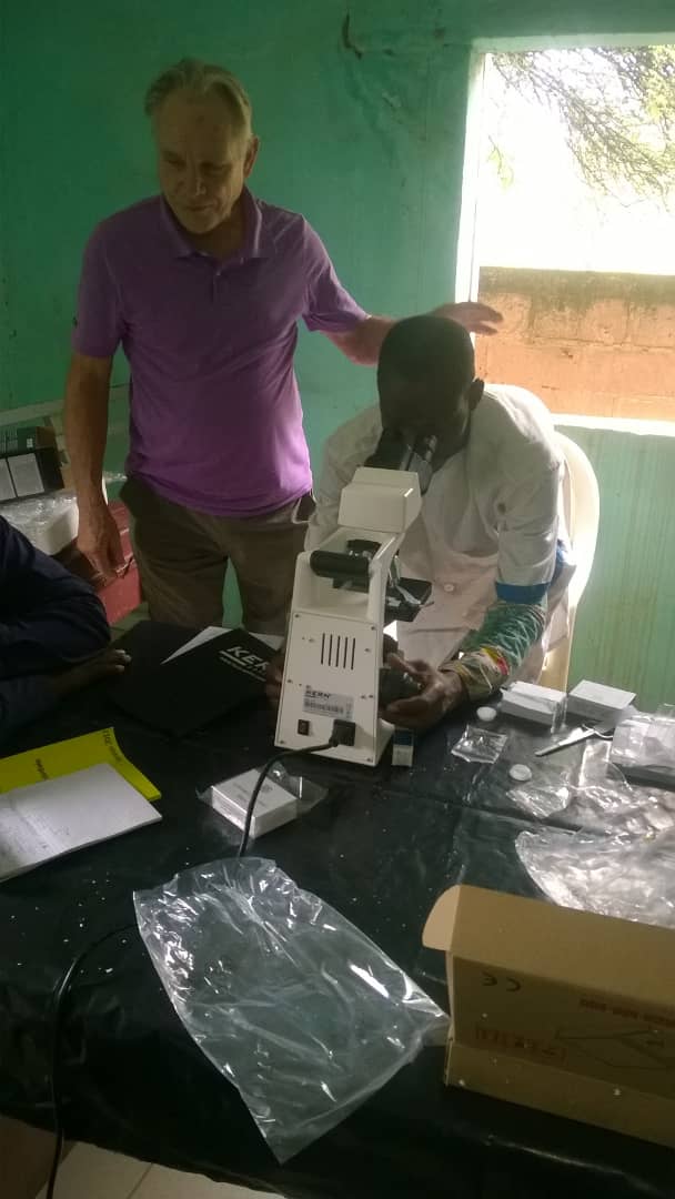 Matériel médical remis au centre de santé d'Awoïny par Jacques Ryckelynck début septembre 2018 : examen de la goutte épaisse au microscope par le laborantin.