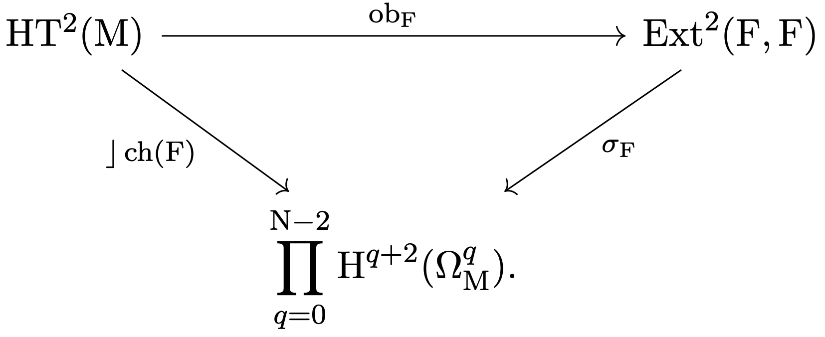 - Define the semiregularity map \[ \sigma_E: \operatorname{Ext}^2(E,E)\rightarrow \oplus_{q=0}^{N-2}H^{q+2}(M,\Omega^q_M) \] and the commutative diagram of Cor. 4.3 in [2] (displayed in Diagram (7.1.2) in [22]).
