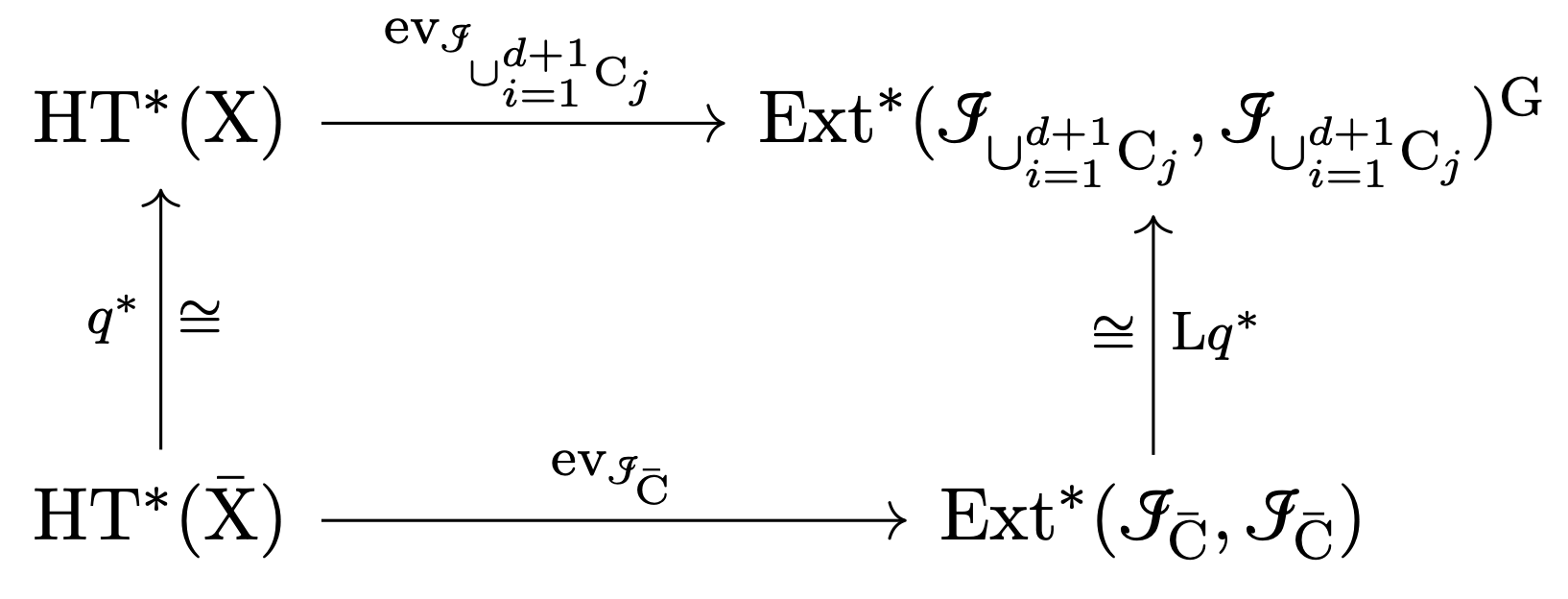 - State (without proof) Prop. 8.3.9 in [22] that the rank of $ob_F$ is $6$. Point out that when the set $\{C_j\}_{j=1}^{d+1}$ is the orbit of $C_1$ under translations by a subgroup $G\subset X$ of order $d+1$, then the quotient morphism $q:X\rightarrow \bar{X}:=X/G$ maps $C_1$ isomorphically onto a curve $\bar{C}\subset \bar{X}$, the ideal sheaf $\mathcal{I}_{\cup_{i=1}^{d+1}C_i}$ is the pullback of $\mathcal{I}_{\bar{C}}$, and \[ Lq^*:\operatorname{Ext}^*(\mathcal{I}_{\bar{C}},\mathcal{I}_{\bar{C}})\rightarrow \operatorname{Ext}^*(\mathcal{I}_{\cup_{i=1}^{d+1}C_i},\mathcal{I}_{\cup_{i=1}^{d+1}C_i})^G \] is an isomorphism. Furthermore, $\mathcal{I}_{\bar{C}}$ is semiregular and $ob_{\mathcal{I}_{\bar{C}}}$ has rank $6$, essentially by the same proof as that of Lemma 8.3.7 in [22]. In that case Prop. 8.3.9 in [22] follows from the fact that $ob_{\mathcal{I}_{\cup_{i=1}^{d+1}C_i}}$ is $G$-equivariant, the $G$-action on $HT^*(X)$ is trivial, $q^*:HT^*(\bar{X})\rightarrow HT^*(X)$ is an isomorphism, and the diagram