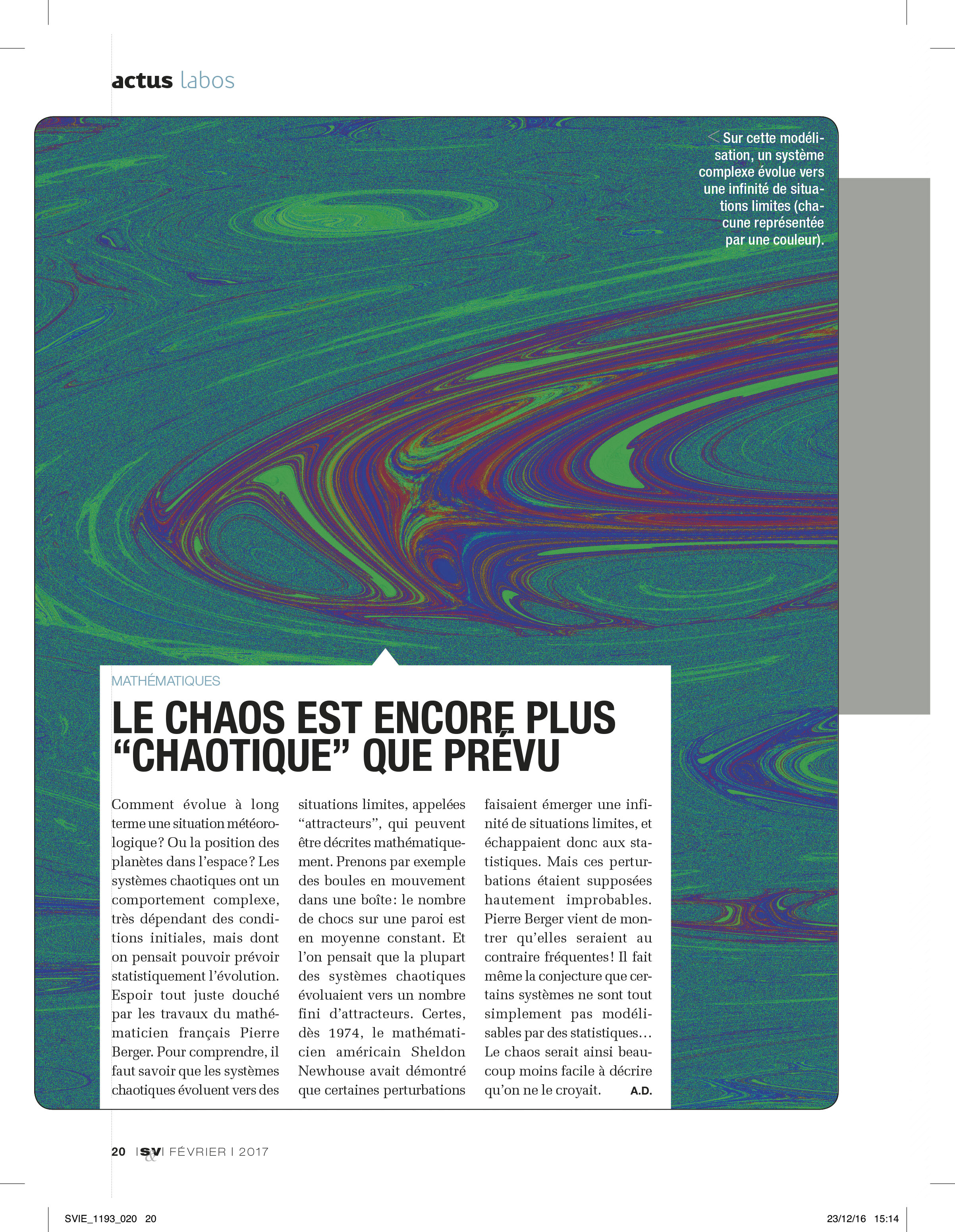 Interview by Francois Beguin, "Les systèmes physiques échappent-ils aux statistiques ?" Images des Mathématiques, (2017). Traduction in italian in Maddmath. P. Berger, La théorie du chaos justifie-t-elle un usage constant des statistiques ?, gazette du laga, 2012. |